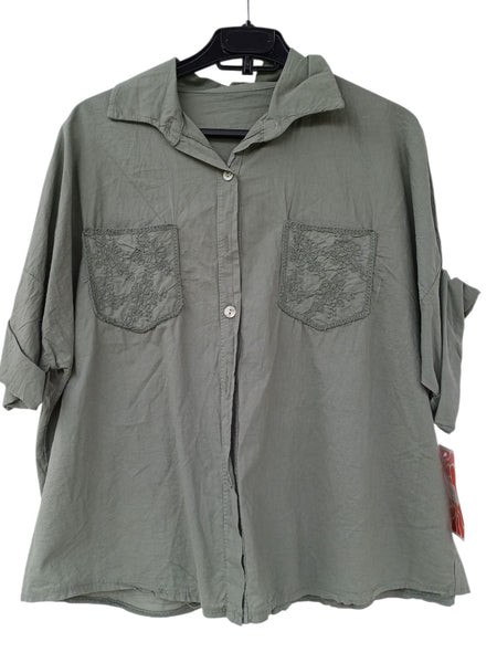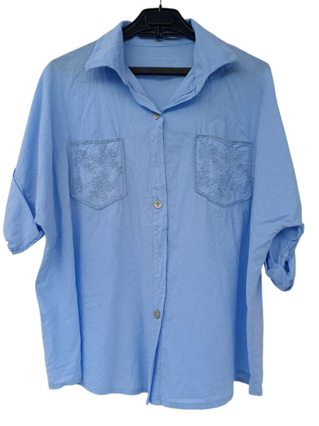 100% ALGODON. BLUSA MANGA CORTA BOTONES BOLSAS BORDADAS.