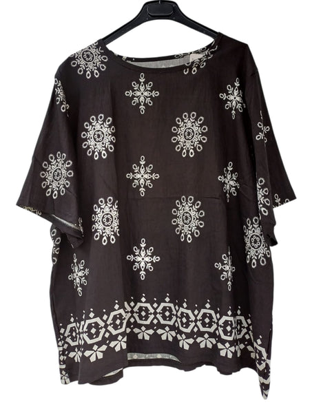 60% VISCOSA 35% LINO 5% ELASTANE. BLUSA MANGA CORTA CUELLO REDONDO ESTAMPADAS.