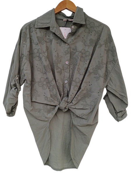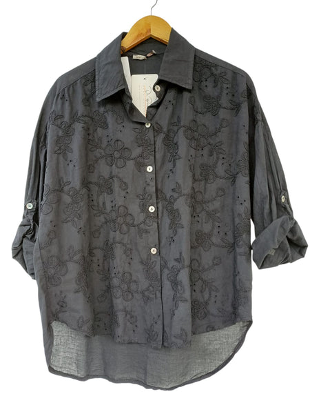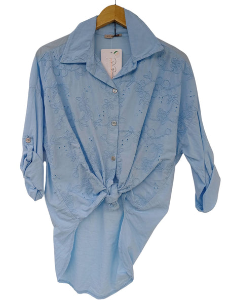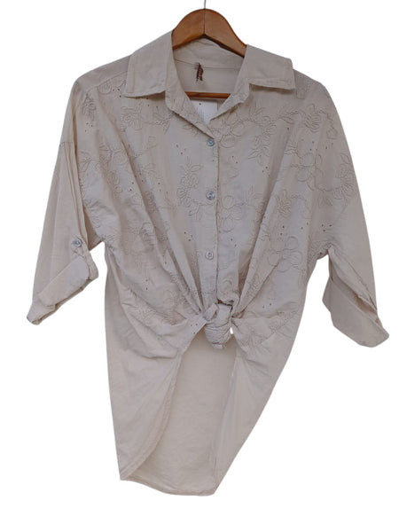 100% ALGODON. BLUSA MANGA TRES CUARTAS REGANGADAS ESTAMPADO FLORES BORDADAS.