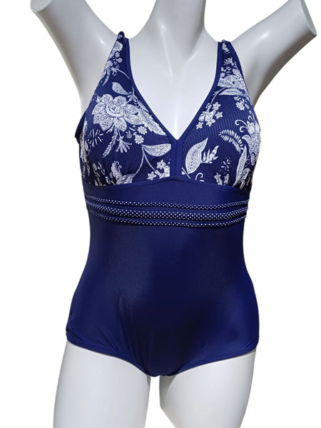 Este traje de baño entero clásico para señora ofrece un diseño elegante con corte a la altura del pecho y franjas estratégicas que crean un efecto visual, estilizando la figura de manera favorecedora. Perfecto para quienes buscan comodidad y un toque sofisticado en su ropa de playa.